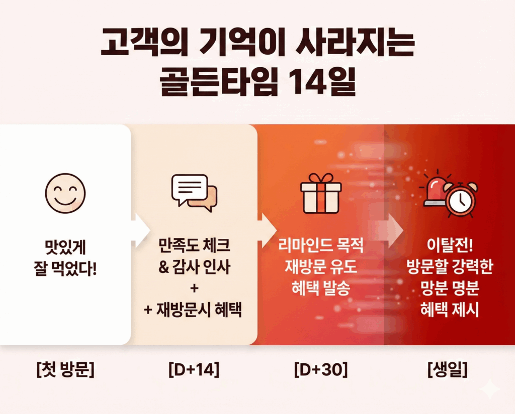 첫 방문 후 2주(14일)가 지나고 한 달(30일)이 다 되어갈 때. 이 시기는 고객의 머릿속에서 우리 매장에 대한 기억이 가물가물해지고 다른 경쟁 매장으로 눈을 돌리기 쉬운 ‘이탈 위험 구간’입니다.